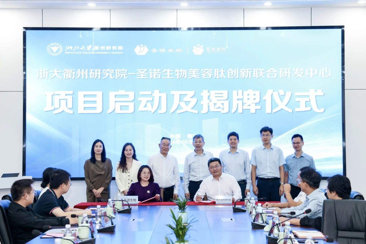 2024年10月14日,“浙江大學(xué)衢州研究院-圣諾生物美容肽創(chuàng)新聯(lián)合研發(fā)中心” 項(xiàng)目啟動(dòng)及揭牌儀式在浙江大學(xué)衢州常山港院區(qū)隆重舉行。